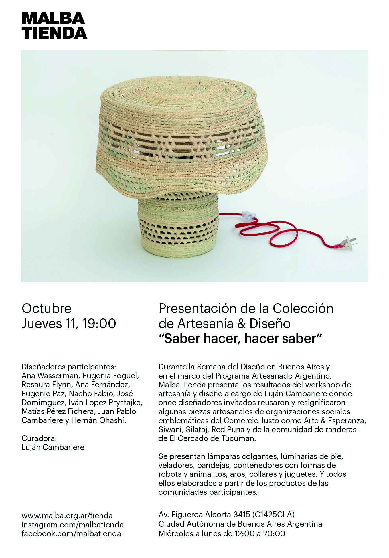 Saber Hacer, Hacer Saber: Una colección de artesanías tradicionales y nuevos productos desarrollados en el marco del Programa de Diseño y Artesanía Argentina,  coordinado por Luján Cambariere, cuya misión fue generar empleo a partir del saber hacer diverso, rico y amplio de nuestro hermoso territorio. Un diseño consciente del uso de materias primas, la revalorización de oficios valiosos y, por encima de todo, un don de hacer con las manos que imprime alma a los objetos.
