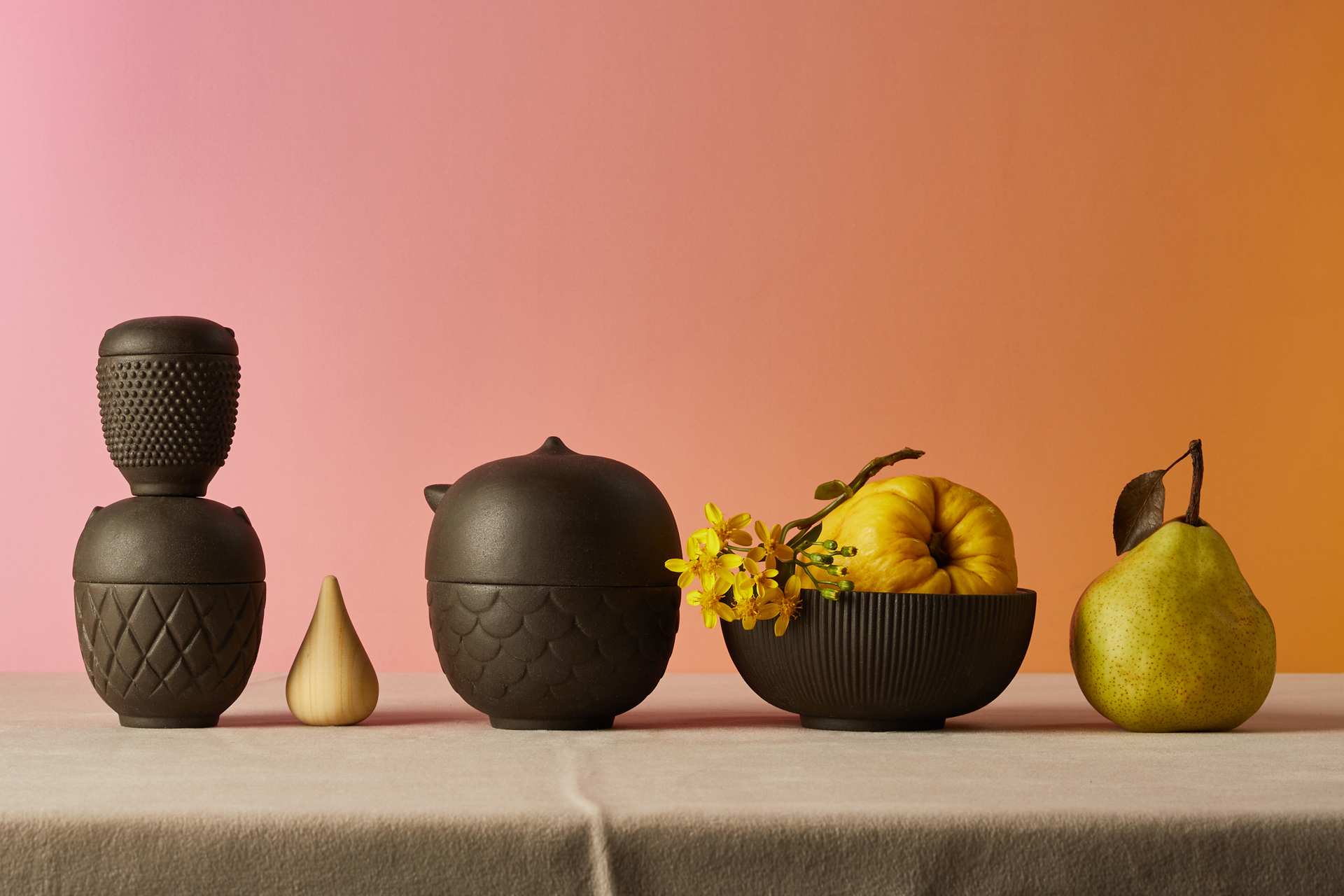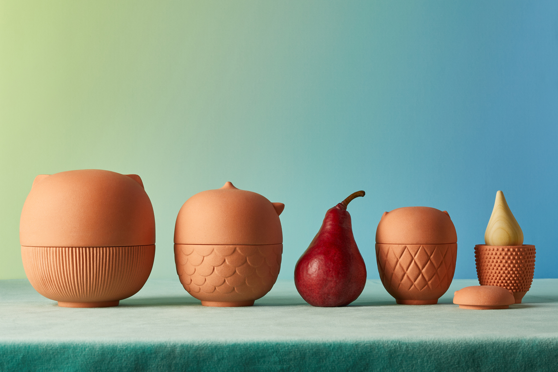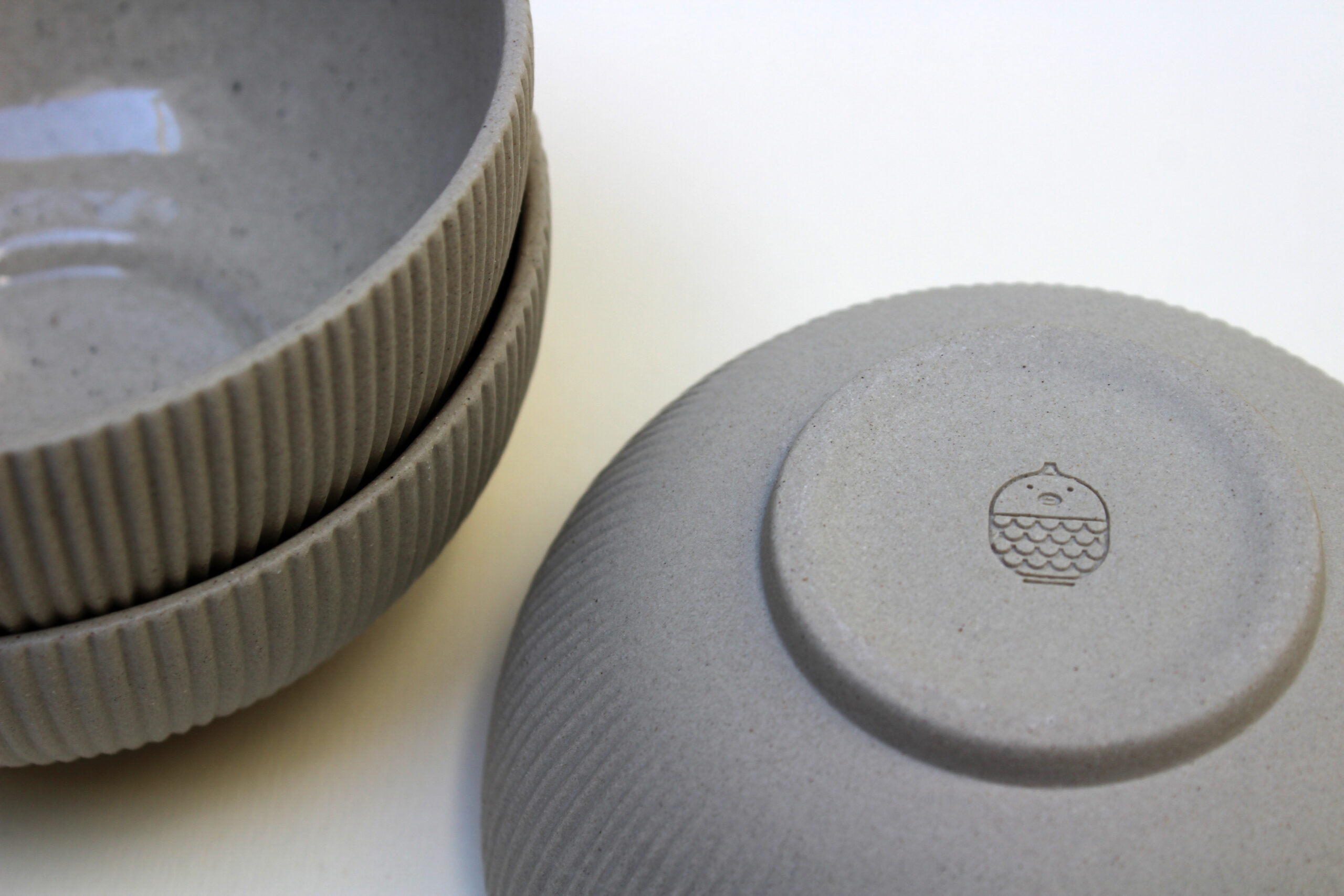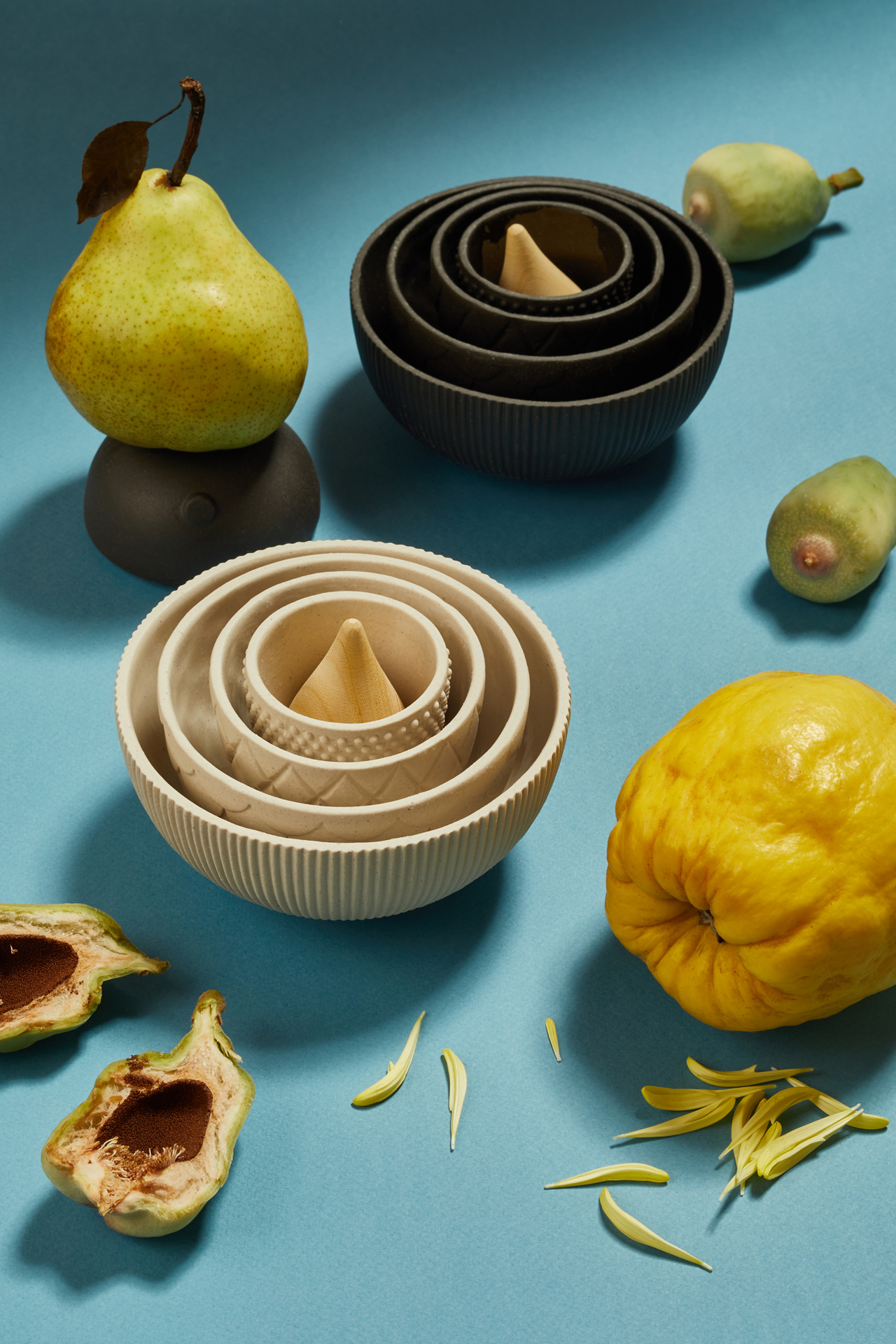 Producto distinguido por el Sello del Buen Diseño Argentino. Juego de contenedores fabricados en gres coloreado. Se trata de cinco figuras en una; cuatro cuencos con tapa y una semilla de madera plasman texturas inspiradas en el mundo animal. En ellos un relato se cuenta a través de las formas: