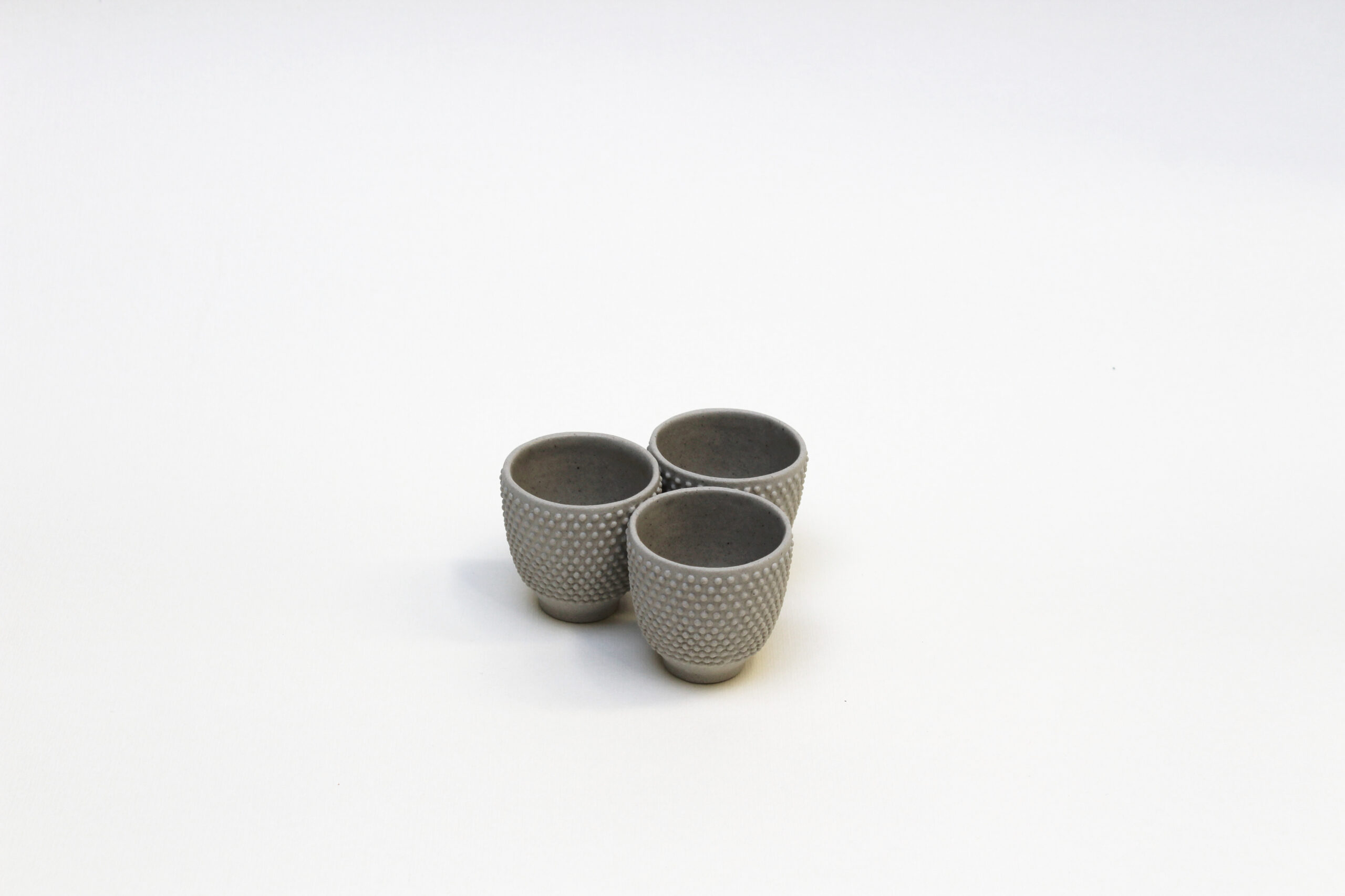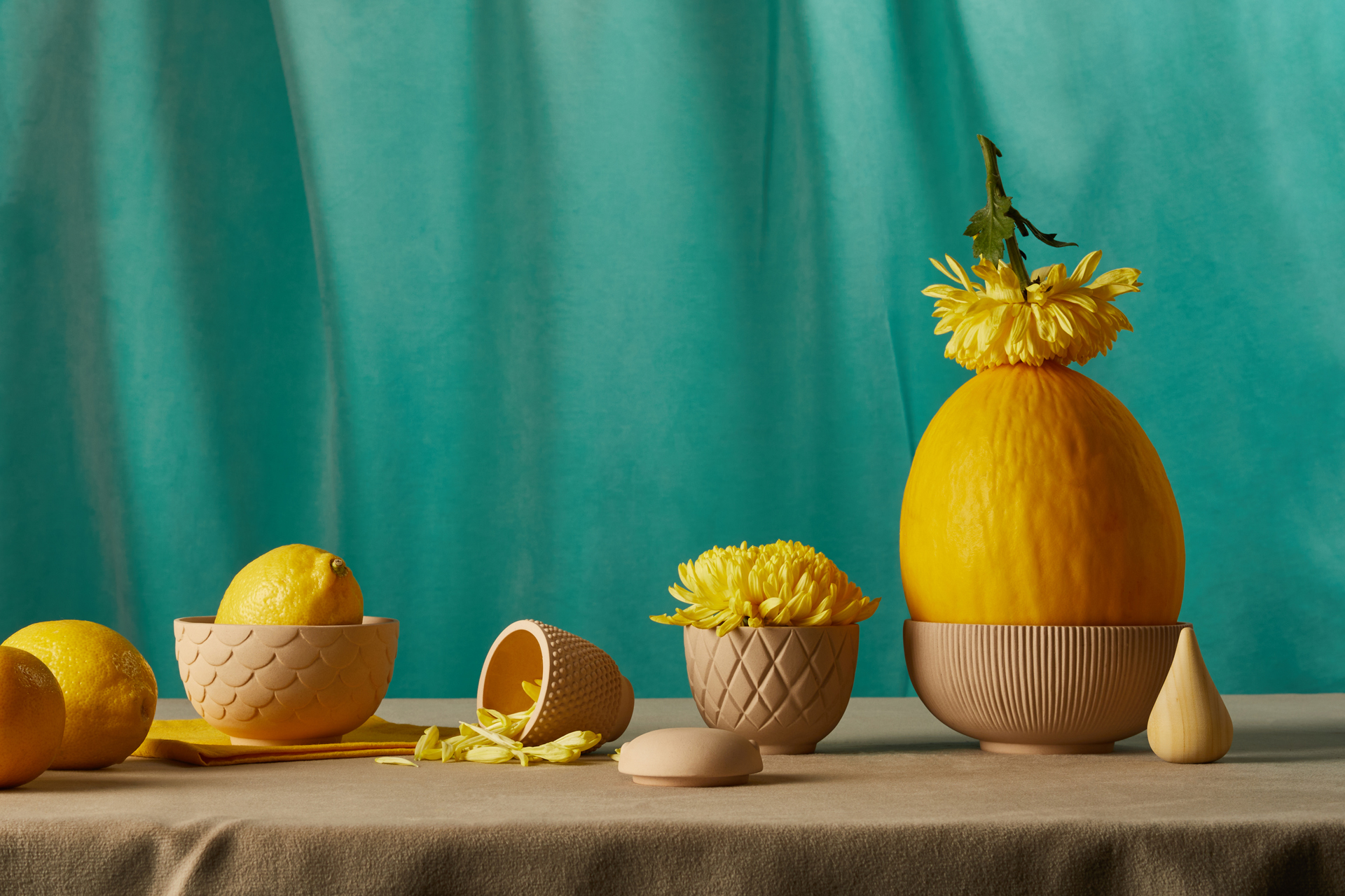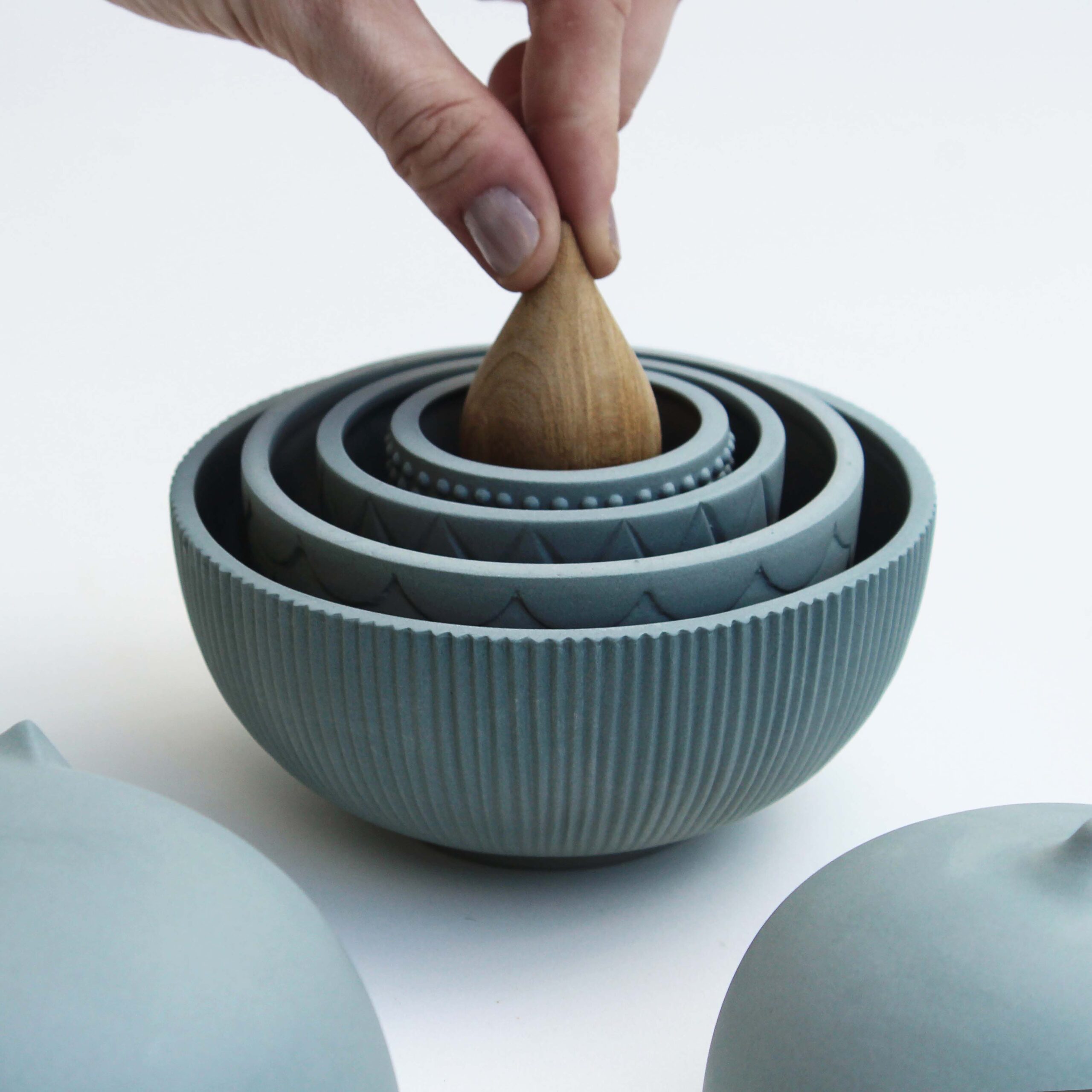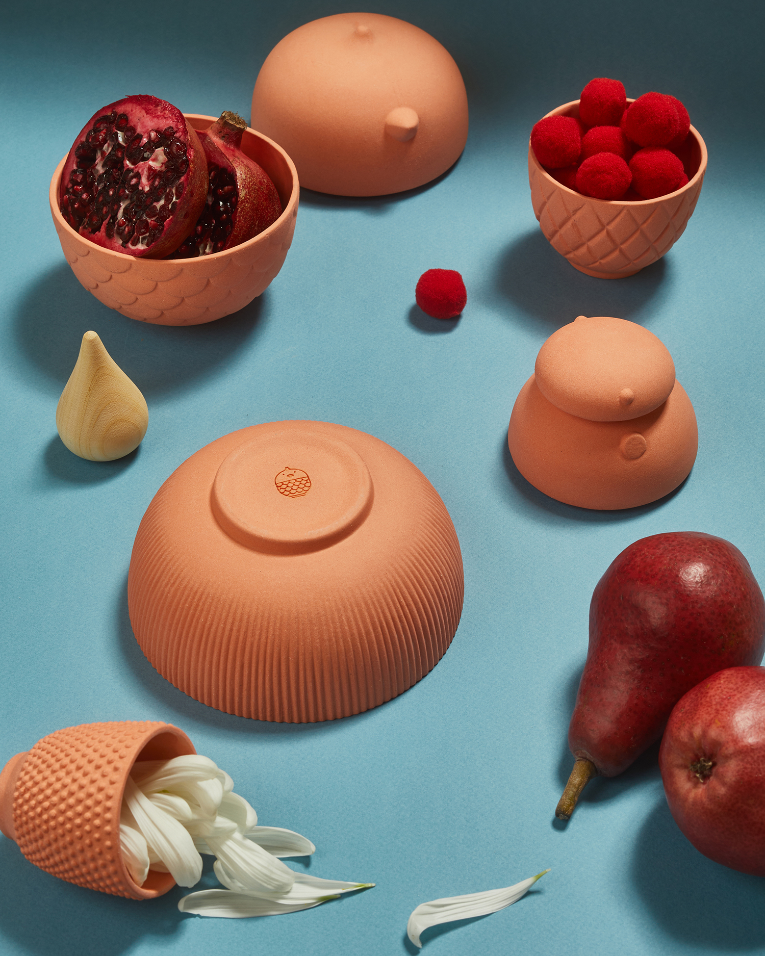 Producto distinguido por el Sello del Buen Diseño Argentino. Juego de contenedores fabricados en gres coloreado. Se trata de cinco figuras en una; cuatro cuencos con tapa y una semilla de madera plasman texturas inspiradas en el mundo animal. En ellos un relato se cuenta a través de las formas: