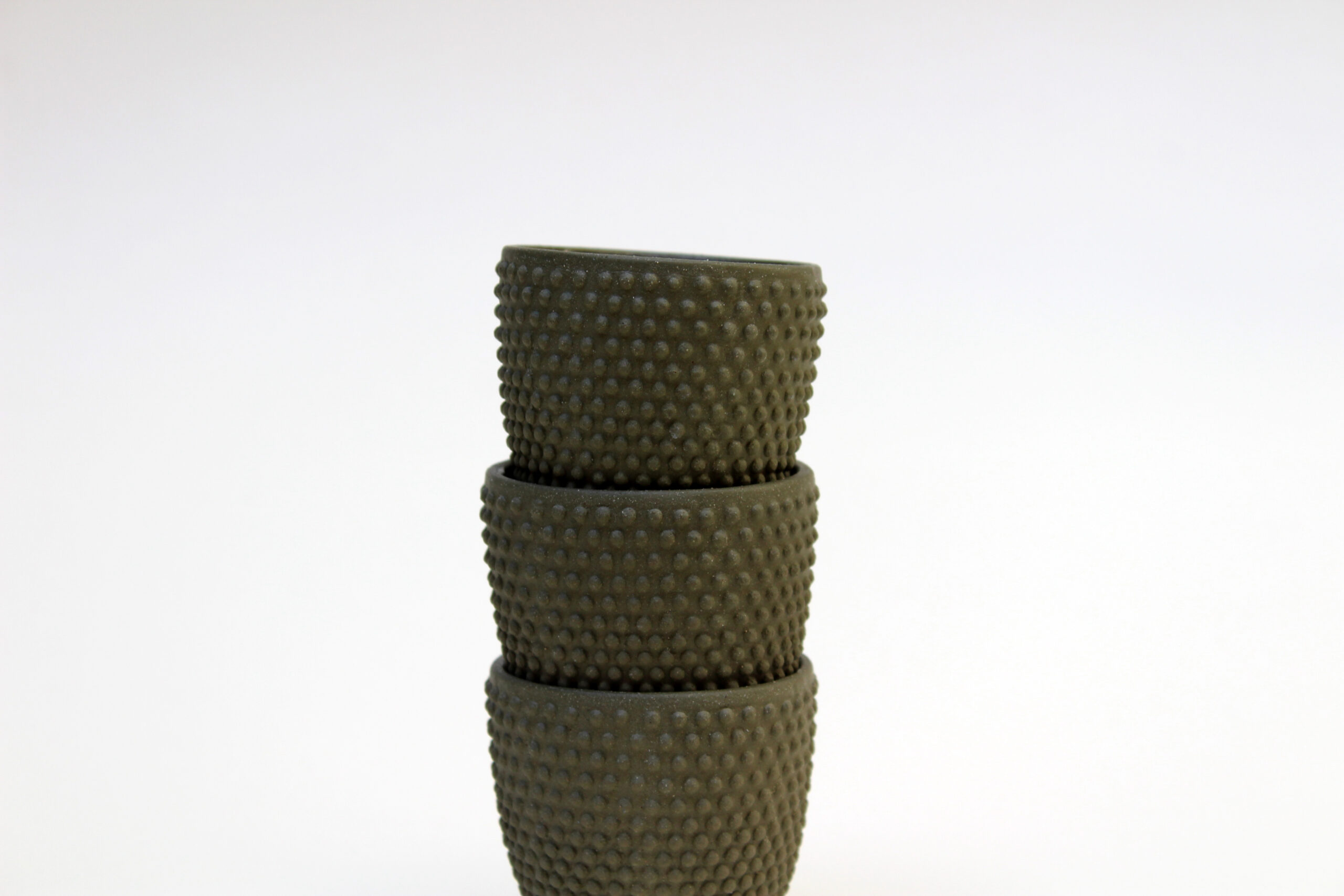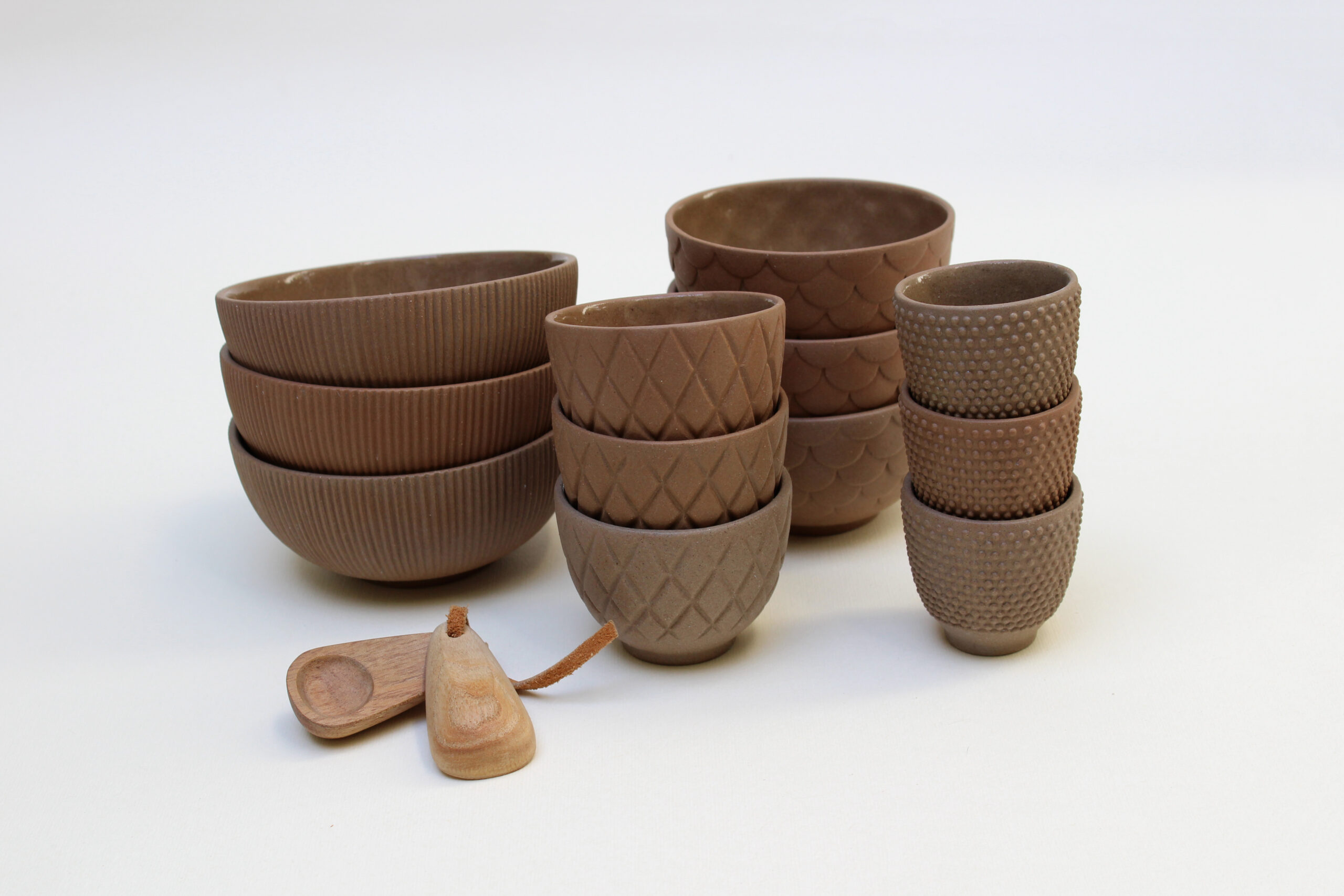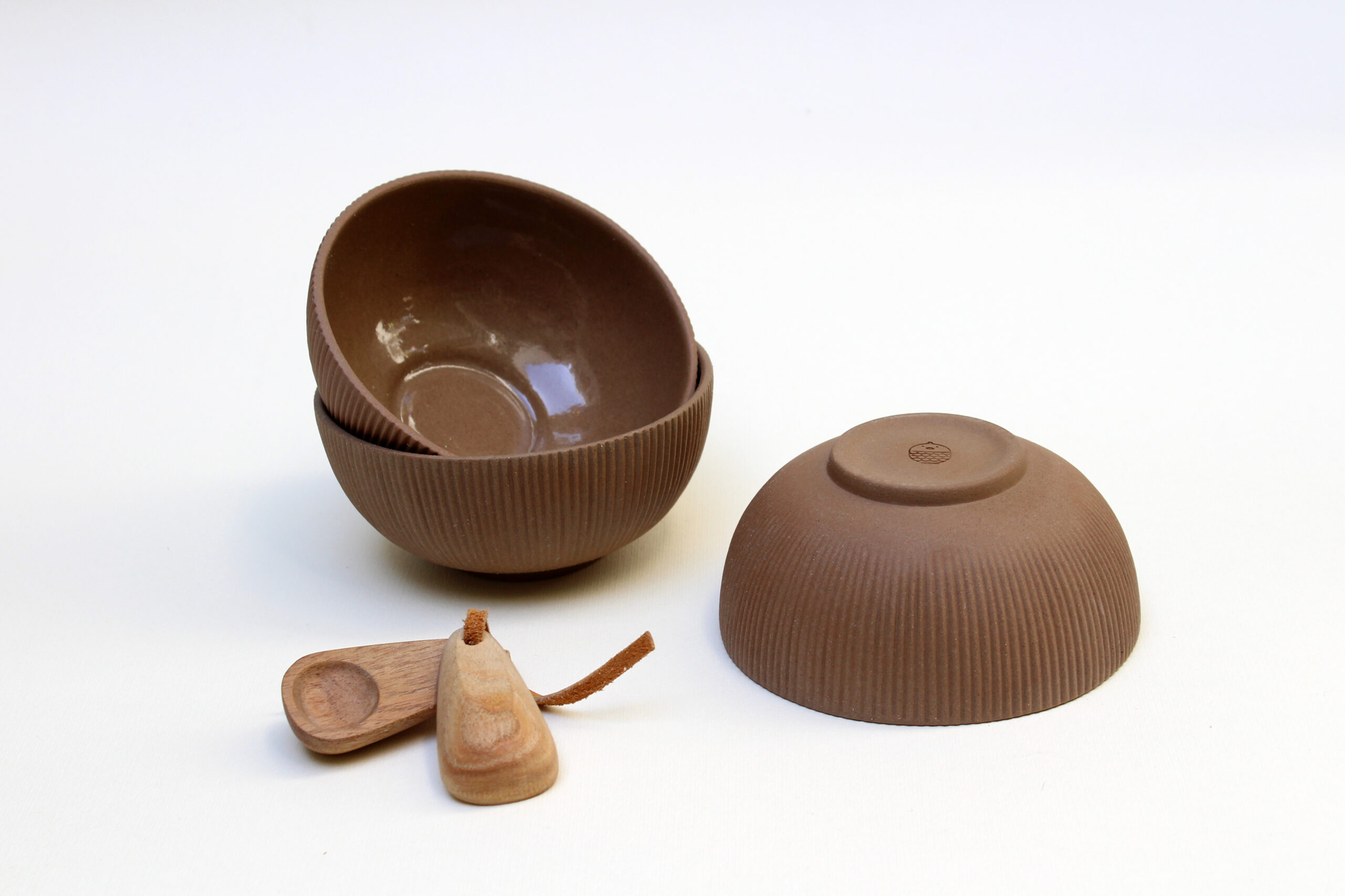 Materiales: Los contenedores se fabrican en gres coloreado esmaltado transparente en su interior y horneados a + 1220°. El esmaltado interior de las piezas hace a los contenedores ser aptos para su uso en la cocina. La semilla es torneada en madera de guatambú.